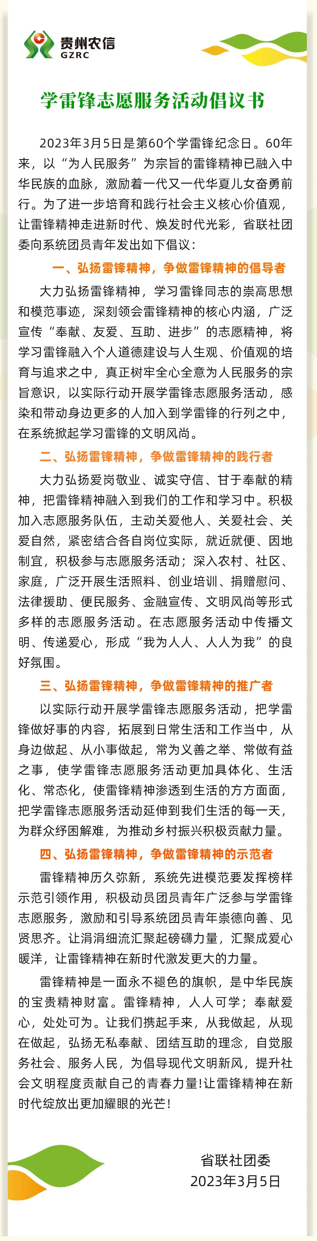 贵州农信团组织学雷锋志愿服务活动倡议书