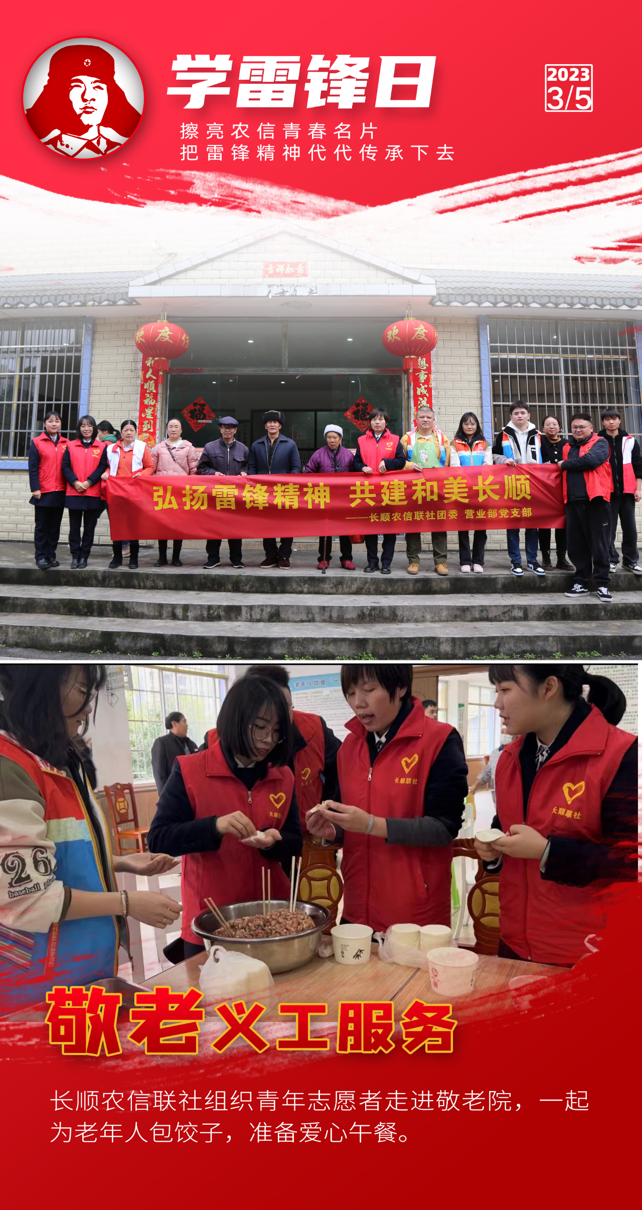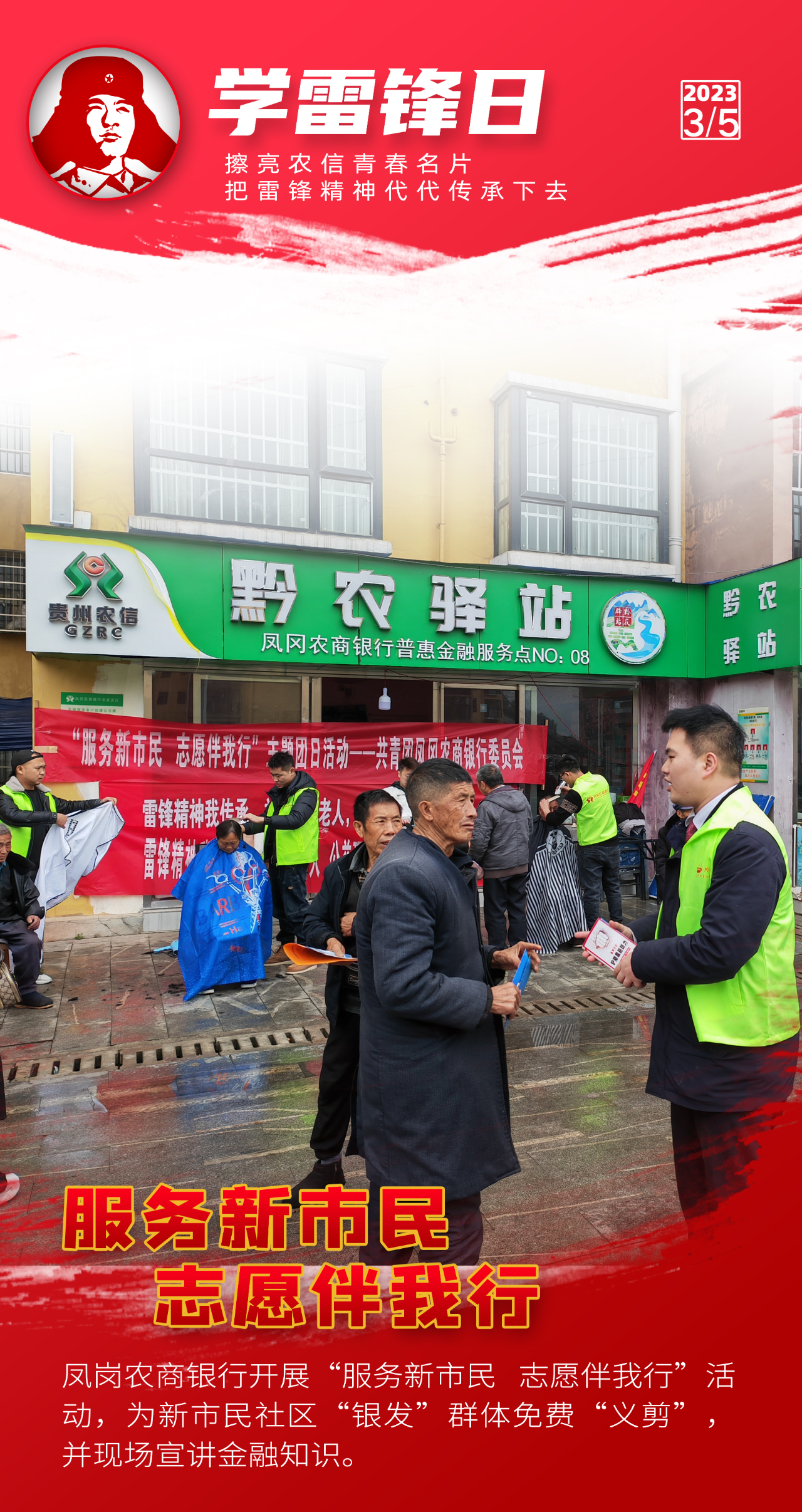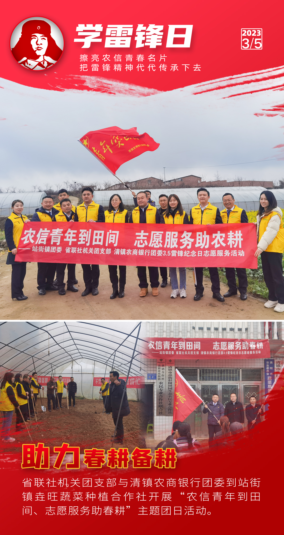 阳春三月,万物争春。今年是毛泽东等老一辈革命家为雷锋同志题词60周年。为深入学习宣传贯彻党的二十大精神,认真贯彻落实习近平总书记关于深入开展学雷锋活动重要指示精神,贵州农信各级团组织积极开展“弘扬雷锋精神擦亮青春名片”志愿服务主题团日活动,持续深化“擦亮青春名片”志愿服务品牌建设,创新志愿服务形式,提升志愿服务层次,在服务三农的最前沿、普惠金融的第一线、乡村振兴的主战场讲好新时代雷锋故事。