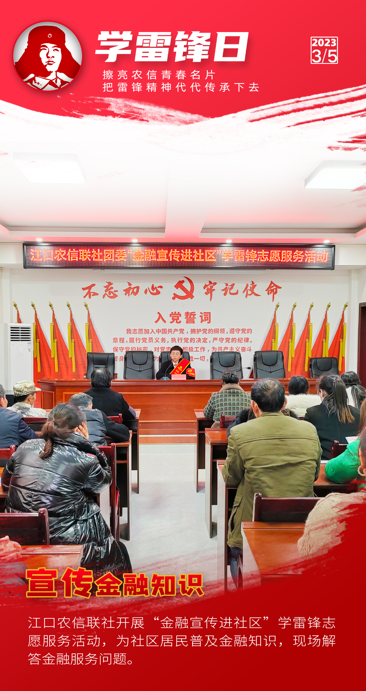 在3月5日学雷锋日到来之际,省联社团委向系统各级团组织和青年员工发出学雷锋志愿服务活动倡议书,号召大家学习雷锋精神,笃践于行争当雷锋、爱岗敬业争创一流、奉献友爱互助进步、传递文明弘扬正气。