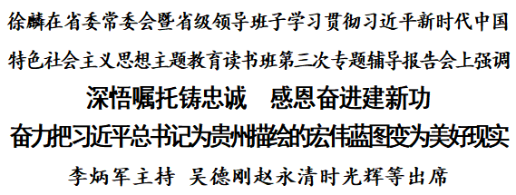 根据党中央部署和省委工作安排,4月23日,省委常委会暨省级领导班子学习贯彻习近平新时代中国特色社会主义思想主题教育读书班第三次专题辅导报告会在贵阳举行。省委书记、省委学习贯彻习近平新时代中国特色社会主义思想主题教育领导小组组长徐麟围绕“学习贯彻习近平总书记视察贵州重要讲话精神和对贵州工作重要指示批示精神”作专题辅导报告。他强调,要深入学习贯彻习近平总书记视察贵州重要讲话精神和对贵州工作重要指示批示精神,更加深刻领悟“两个确立”的决定性意义,更加坚定自觉衷心拥护“两个确立”、忠诚践行“两个维护”,深悟嘱托铸忠诚、感恩奋进建新功,奋力把习近平总书记为贵州描绘的宏伟蓝图变为美好现实。