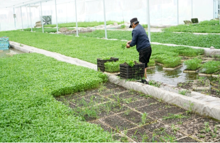 图为:村民在育苗大捞盘出苗