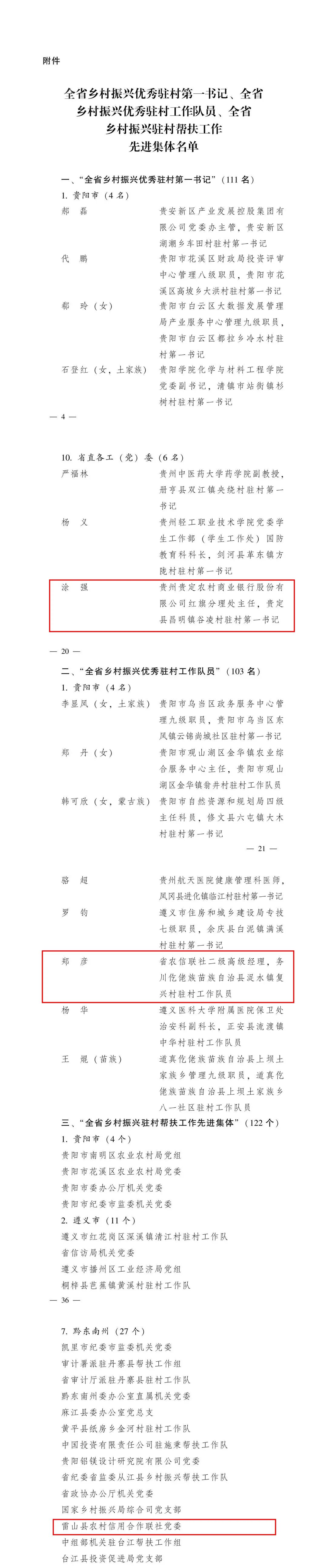 为表彰先进、弘扬正气,此次省委党的建设工作领导小组共对111名“全省乡村振兴优秀驻村第一书记”、103名“全省乡村振兴优秀驻村工作队员”、122个“全省乡村振兴驻村帮扶工作先进集体”进行表彰。其中,雷山农信联社党委荣获“全省乡村振兴驻村帮扶工作先进集体”;贵定农商银行红旗分理处主任,昌明镇谷凌村驻村第一书记涂强荣获“全省乡村振兴优秀驻村第一书记”;省联社二级高级经理,务川县浞水镇复兴村驻村工作队员郑彦荣获“全省乡村振兴优秀驻村工作队员”。