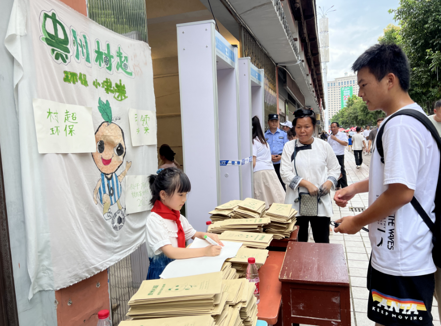 得益于在农信社多年的工作经验,赖蕾将周边村寨的手艺人集结起来,在“村超”村味十足的纯粹中,又走出了一条专属榕江的民族特色致富道路。与“村超”同频共振,榕江人全家为“村超”而动的场面,已经习以为常。“村超”足球场上受欢迎的环保垃圾袋就是来自赖蕾小侄女欣欣的新创意。“阿姨,需要一份‘村超’专属环保袋吗?”在足球场入口,欣欣不厌其烦地一遍遍宣传着。“如果‘村超’能把环保主题做好的话,这是最大的成功。足球粉丝和球迷们可以更好地观看足球比赛。”欣欣说。