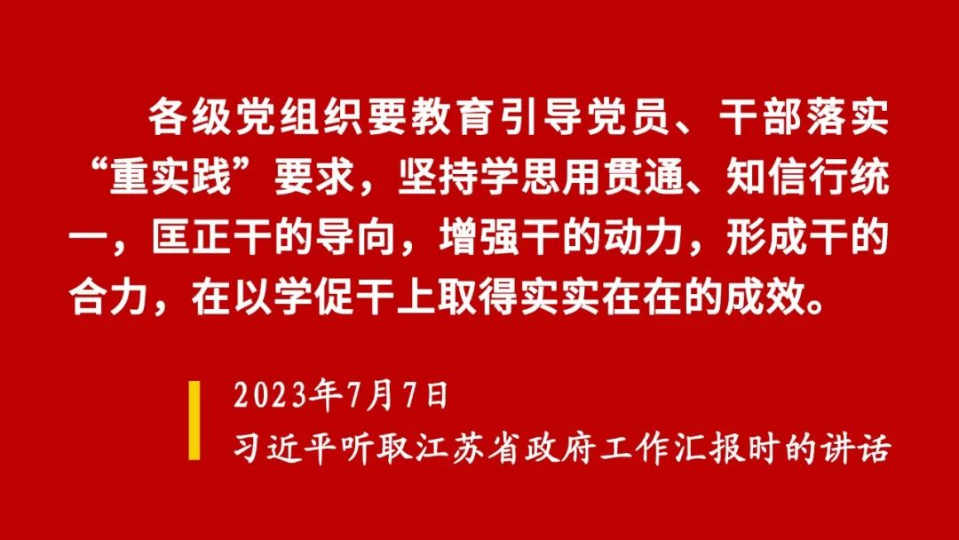 “各级党组织要教育引导党员、干部落实‘重实践’要求,坚持学思用贯通、知信行统一,匡正干的导向,增强干的动力,形成干的合力,在以学促干上取得实实在在的成效。”习近平总书记近日在江苏考察时就“以学促干”提出明确要求、作出具体部署,为进一步推动学习贯彻习近平新时代中国特色社会主义思想主题教育走深走实指明努力方向。