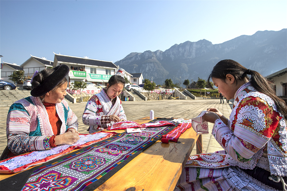 图:黔西化屋村,村民们正在制作苗族刺绣