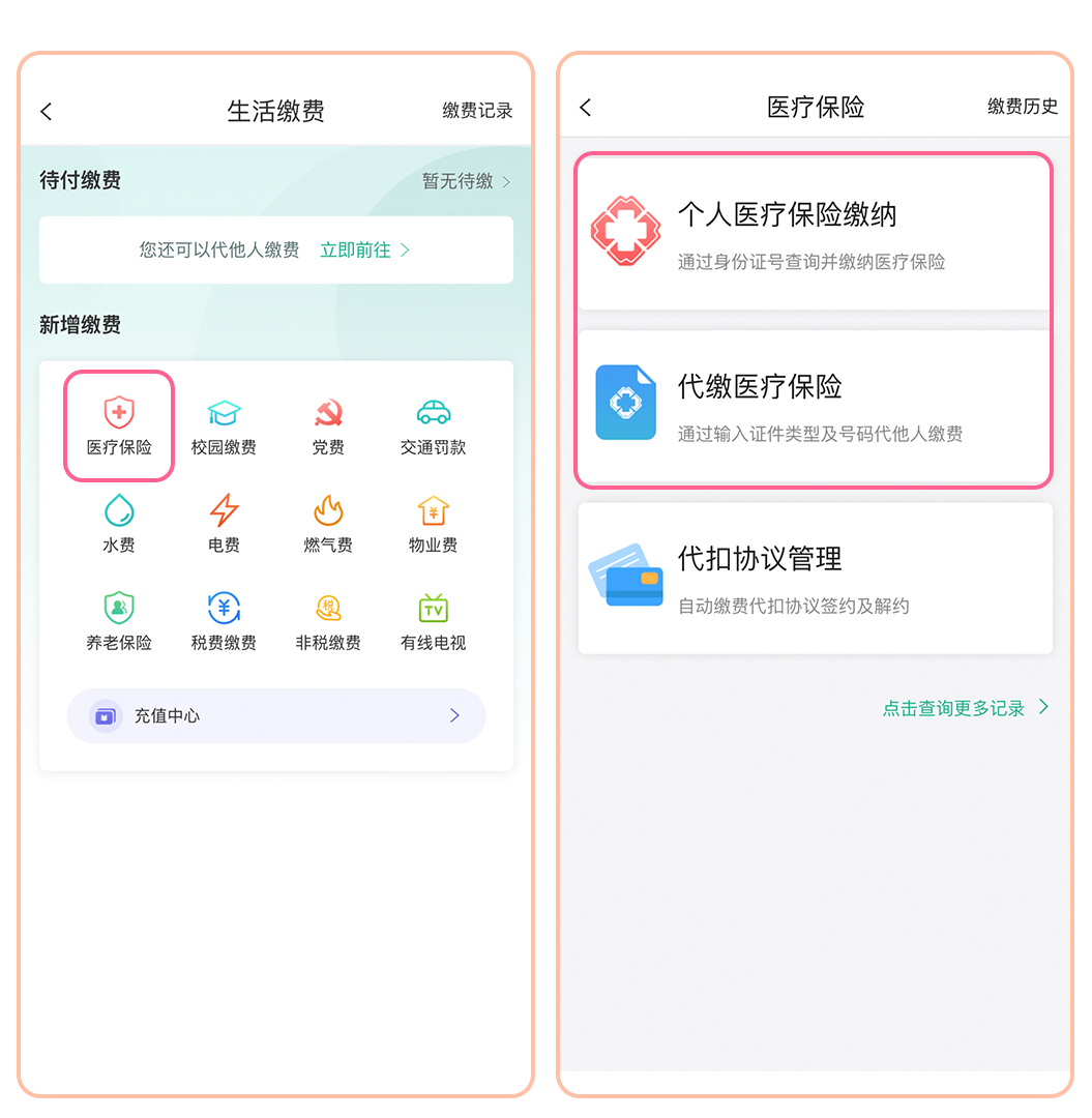 步骤二:点击“医疗保险”,个人缴费选择“个人医疗保险缴纳”,他人代缴选择“代缴医疗保险”