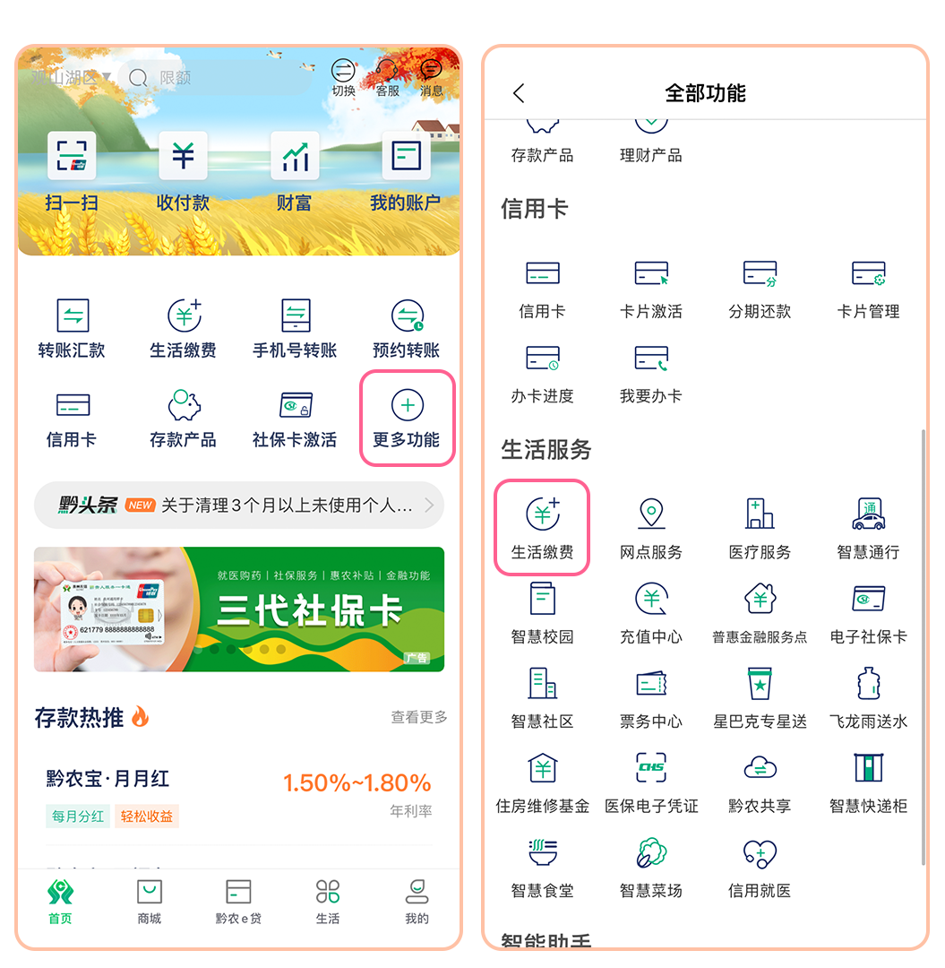 步骤一:打开并登录黔农云APP,点击首页“生活缴费”(或点击“更多功能”,选择“生活缴费”)