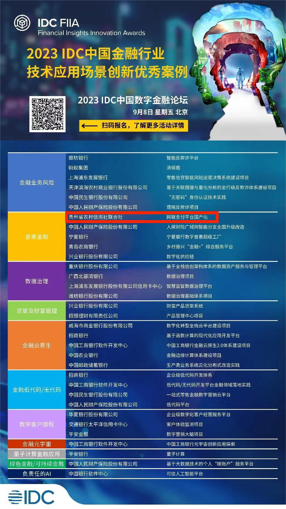 近日,由全球著名信息技术研究与咨询机构--国际数据公司IDC主办的“2023IDC中国数字金融论坛”在北京圆满落幕,贵州农信网联支付平台国产化项目从全国120个优秀项目中斩获普惠金融类“2023IDC中国金融行业技术应用场景创新奖”。
