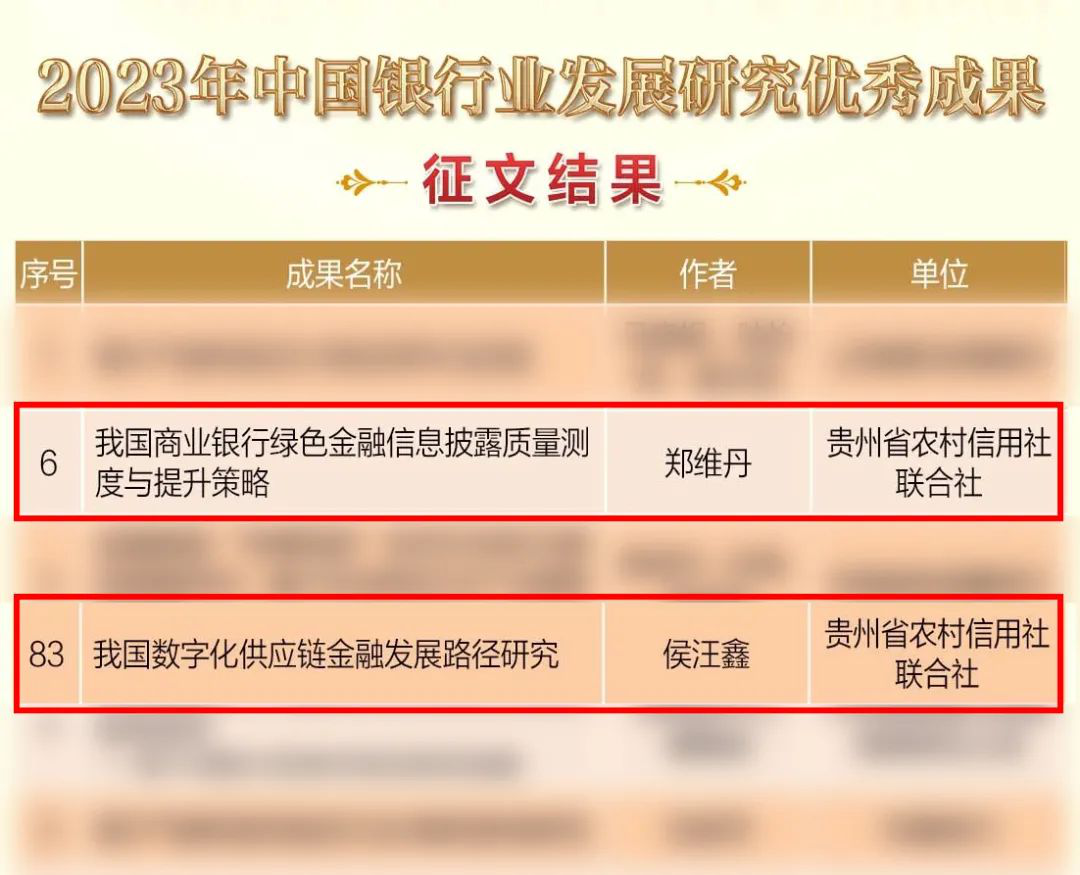 2023年9月25日,中国银行业协会公布了“中国银行业发展研究优秀成果征文(2023)”结果,贵州农信获奖2篇成果,在全国农信系统中获奖数量最多、占比最高、排名最为靠前,得到了中国银行业协会通报表扬。其中,《我国商业银行绿色金融信息披露质量测度与提升策略》文章总排名第6。