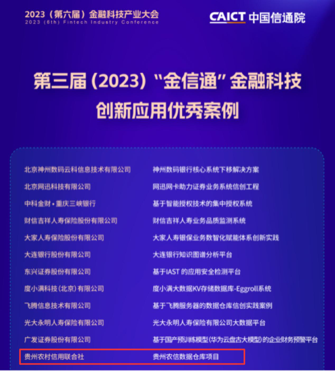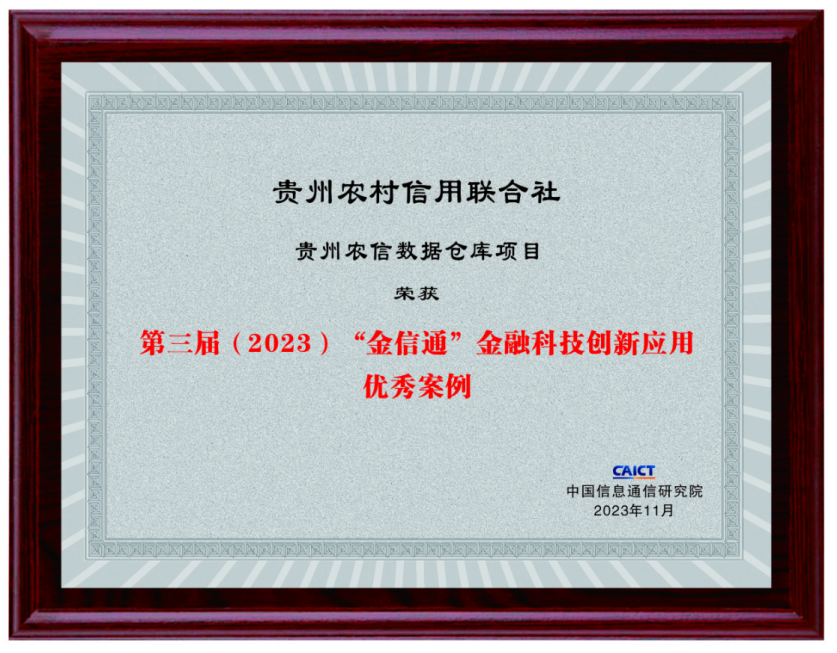 近日,由中国信息通信研究院组织的2023(第三届)“金信通”金融科技创新应用优秀案例评选结果揭晓,贵州农信数据仓库项目荣获“金融科技创新应用优秀案例奖”。