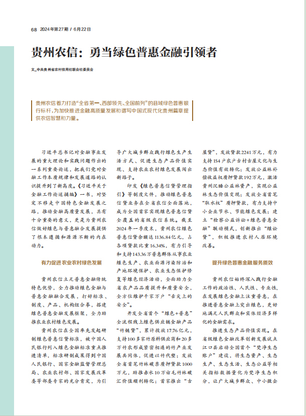 贵州农信在全国率先发起研制绿色普惠信贷标准,被中国人民银行列入绿色金融标准重点推进清单,标准研制成果得到中国人民银行、国家金融监督管理总局、农业农村部、国家发展改革委等部委专家的充分肯定,为引导广大城乡群众践行绿色生产生活方式、促进生态产品价值实现、支持农业农村绿色发展闯出新路子。