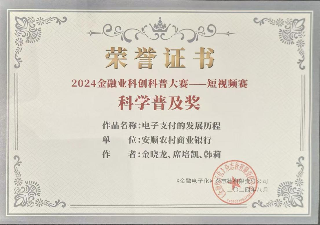 近日,在中国金融电子化集团《金融电子化》杂志社主办的2024金融科技应用创新发展大会第四届“金融业科创科普大赛——短视频赛”中,贵州农信选送的安顺农商银行制作“电子支付发展历程”作品,从来自全国近300家机构545个参选作品中脱颖而出,荣获“科学普及奖”。
