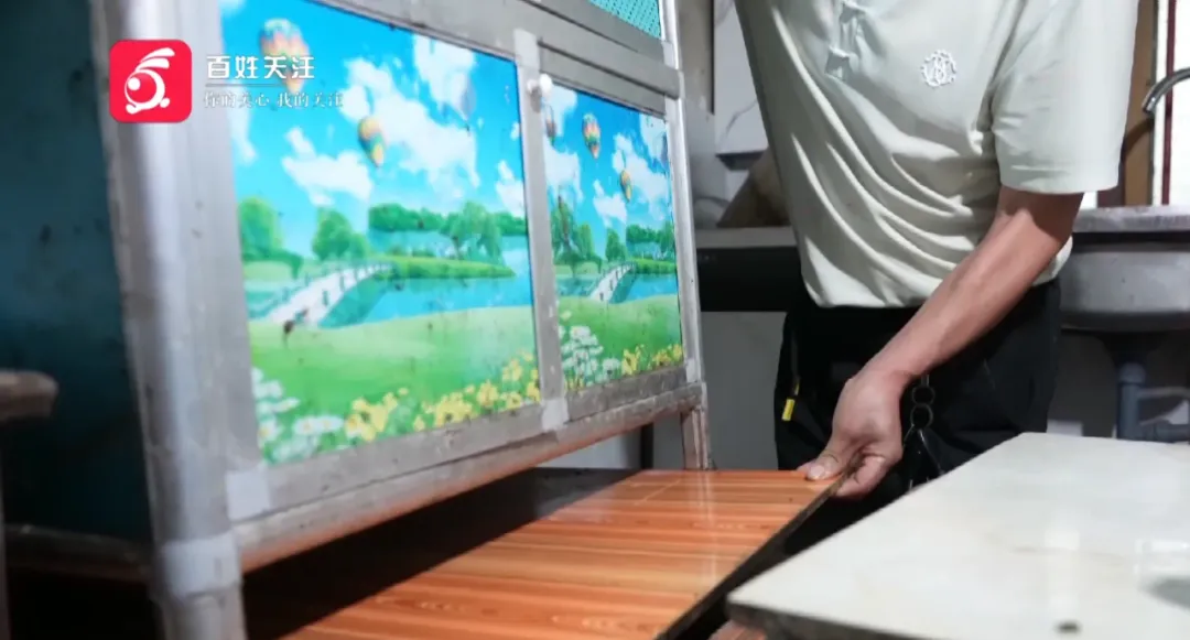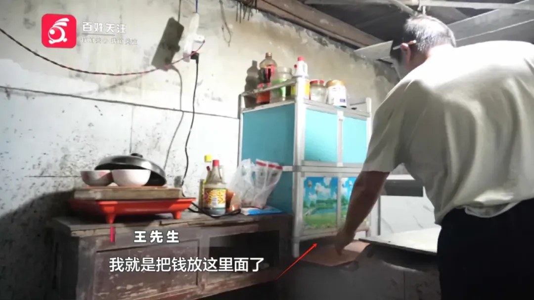 王先生:我就是把钱放这里面了,砧板放在这里,小孩子煮饭,舀水来洗的时候就淋湿了。这里是一个洞,当初放在这里我觉得安全一点。