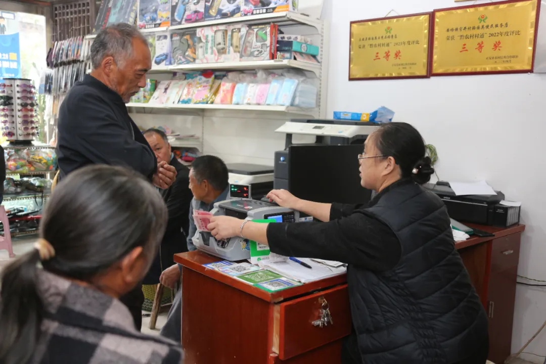 瑞濠街道办瑞新村惠仁路A-907号门面,位于大街十字路口,是正安县社保局与正安联社开设的“社银一体化”同远便民店。商户张同远每天上午八点开门,而关门时间大多在晚上十点钟左右。移民搬迁到此安家的3700多户居民上街散个步就能缴电费、查社保、缴社保、取养老金,还能享受到四星级普惠金融服务。“有时候会更晚些,做的就是这个事,随叫随到。”张同远说,“也有早上六七点钟就打电话预约,要早点取钱回老家走亲戚。”“社银一体化”国英便民店,地处安场镇老街的背街。农历十月十二日(阳历11月12日),安场镇赶乡场的日子。刚开门,村民们就拿着社保卡、银行卡开始自主排队——坐在柜台两边的长板凳上,等候骆国英“叫号”取钱、缴电费、缴社保、做社保卡人脸识别认证。“赶场天都是个样子,看嘛,都十一点过了,只有早餐午饭一起吃了啥。”骆国英操作熟练,有说有笑,“下一位,徐志华做准备。”据正安农信联社业务部门的员工介绍,骆国英店的社保业务办理量在全省都是数一数二的,仅仅社保查询、社保卡人脸认证今年就做了2225笔,惠及人数1127人。