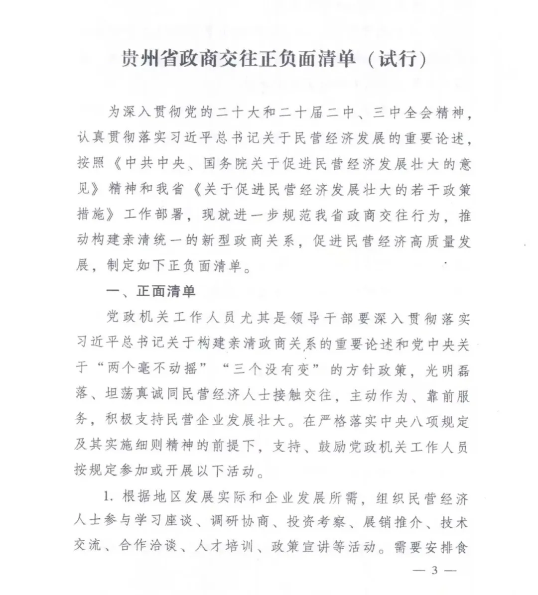 为深入贯彻党的二十大和二十届二中、三中全会精神,认真贯彻落实习近平总书记关于民营经济发展的重要论述,按照《中共中央、国务院关于促进民营经济发展壮大的意见》精神和贵州省《关于促进民营经济发展壮大的若干政策措施》工作部署,进一步规范政商交往行为,推动构建亲清统一的新型政商关系,促进民营经济高质量发展。日前,《贵州省政商交往正负面清单(试行)》正式印发。