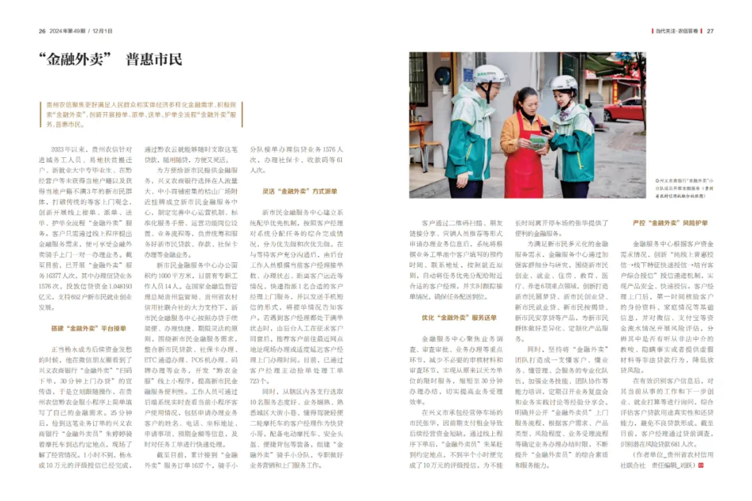 2023年以来,贵州农信针对进城务工人员、易地扶贫搬迁户、新就业大中专毕业生、在黔经营户等未获得当地户籍以及获得当地户籍不满3年的新市民群体,打破传统的等客上门观念,创新开展线上接单、派单、送单、护单全流程“金融外卖”服务。客户只需通过线上程序提出金融服务需求,便可享受金融外卖骑手上门一对一办理业务。截至目前,已开展“金融外卖”服务16377人次,其中办理信贷业务1576次,投放信贷资金1.048193亿元,支持652户新市民就业创业发展。