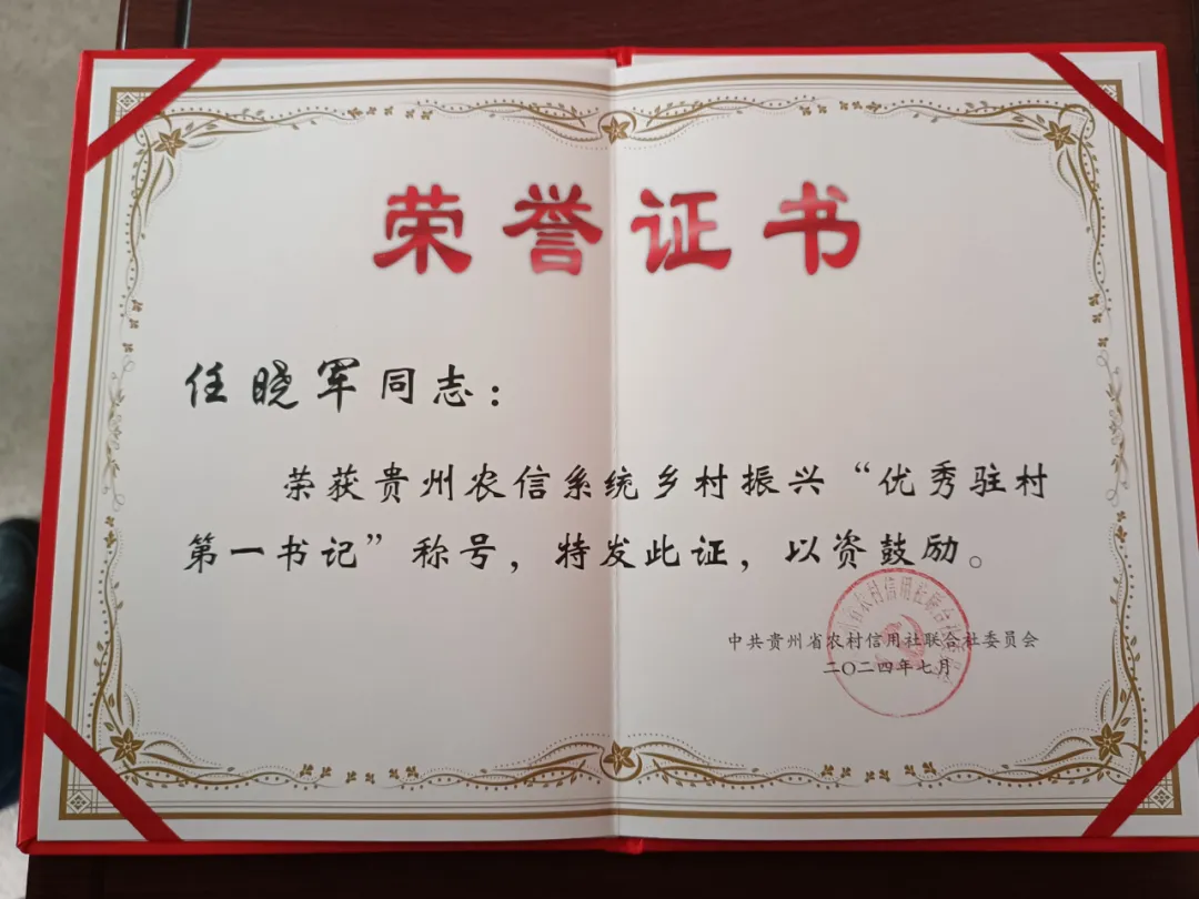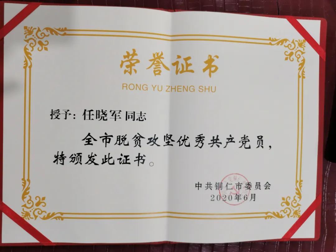 他还先后荣获“全市脱贫攻坚优秀共产党员”“全市乡村振兴优秀驻村工作队员”“贵州农信系统乡村振兴优秀驻村第一书记”“铜仁农信系统优秀驻村人员”等荣誉称号,是全省唯一一个59岁仍奋战在乡村振兴一线的第一书记。
