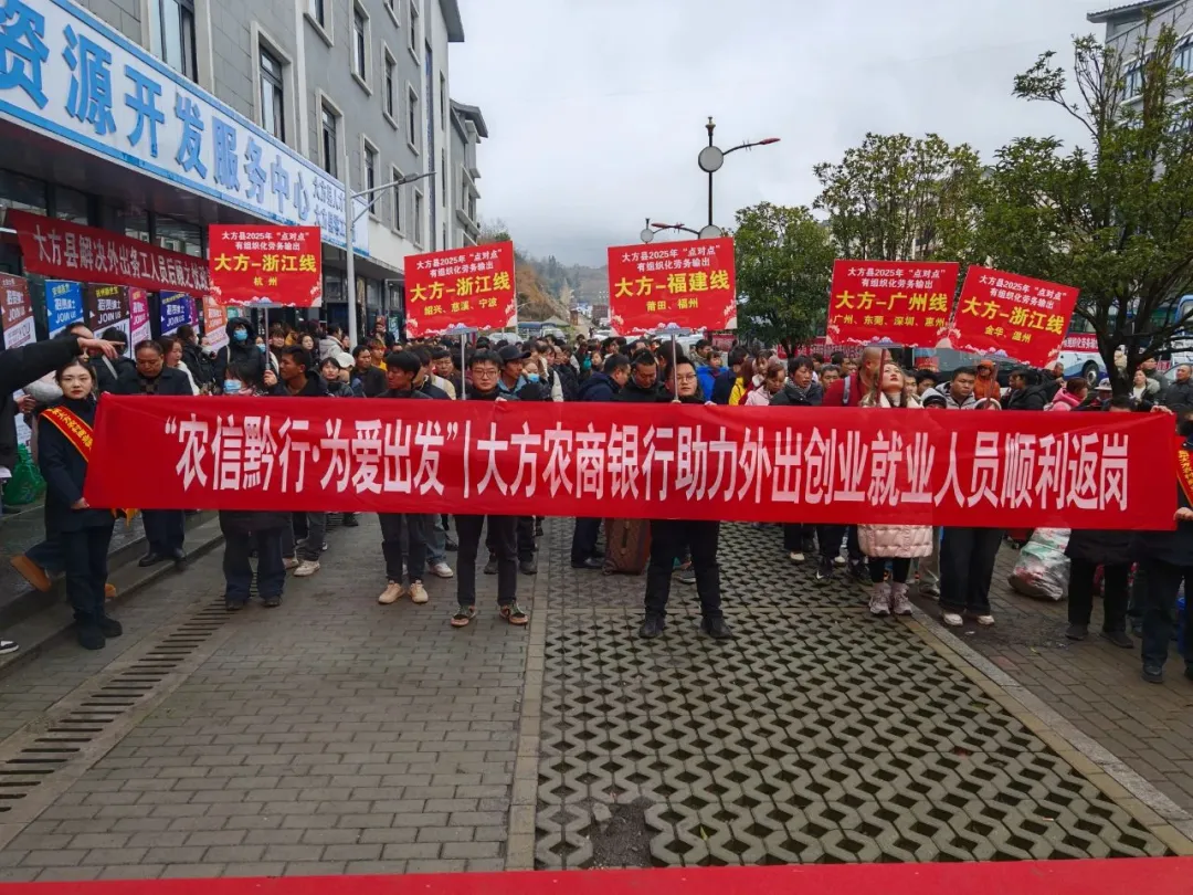2月13日,大方农商银行协同大方县人力资源和社会保障局开展外出创业就业人员返岗复工欢送活动,多措并举为返岗复工老乡保驾护航。