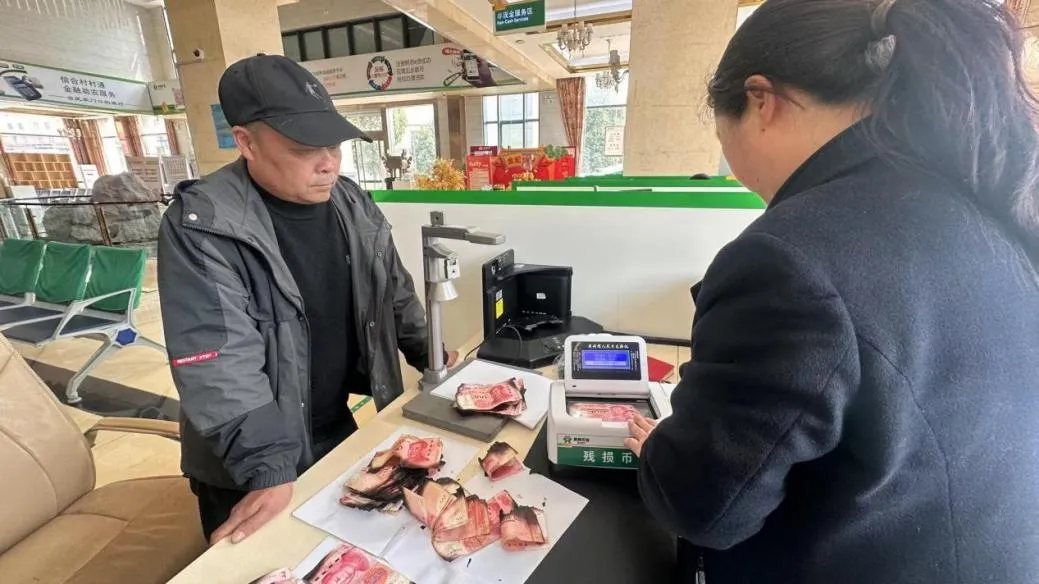 3月21日13时许,一位中年男子手拎着一袋残损人民币,火急火燎地走进普定农商银行定南支行大厅,焦急地询问:“你好,能帮我看看这些钱还能兑换吗?”工作人员立马上前询问情况。