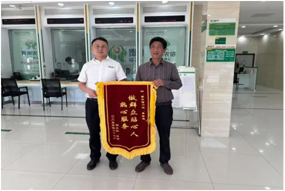 “我找你们信用社说贵阳话的那个小伙,昨天晚上他帮了我一个大忙!”4月18日早上,一男子匆匆来到盘县农信联社普古信用社,送上印有“做群众贴心人热心服务”的锦旗以示感谢。