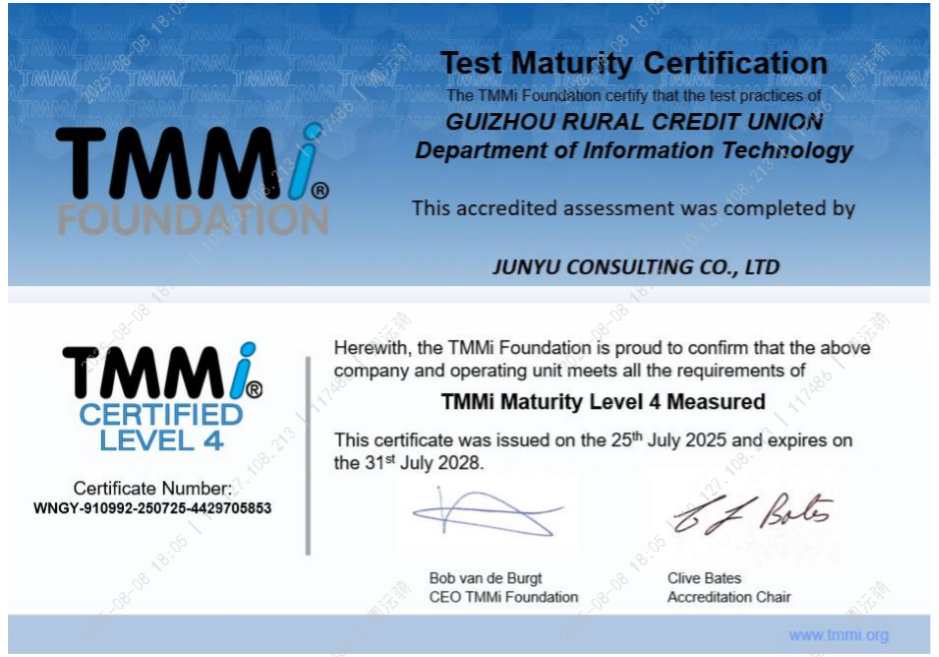 近日,贵州省农村信用社联合社(以下简称“贵州农信”)信息科技部成功通过TMMi(测试能力成熟度模型集成)等级评估,荣获TMMi4级(已测量级)认证证书,成为西南地区首家、全国第3家获此殊荣的省级农信机构。这一重要认证标志着贵州农信在软件质量管理和测试能力建设方面已达到行业先进水平。